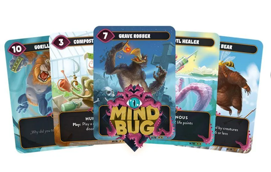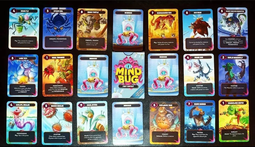 In Mindbug ogni giocatore avrà un mazzo di 10 carte casuali prese da un mazzo comune. Con queste carte si dovranno portare a 0 i punti vita dell’avversario (3 ad inizio partita). Si avranno sempre 5 carte in mano, ognuna rappresentante una creatura. Le creature avranno una forza, con cui potranno attaccare l’avversario, e/o abilità che si potranno attivare in determinate occasioni, come ad esempio quando verranno giocate, distrutte o quando attaccheranno. Nel proprio turno un giocatore potrà giocare una carta dalla propria mano, senza nessun costo, o attaccare con una creatura già presente sul campo di battaglia. A questo punto il giocatore in difesa potrà subire un danno o bloccare con una creatura: ovviamente la creatura con meno forza perirà nello scontro. L’aspetto più interessante di questo gioco è il Mindbug: quando un giocatore gioca una carta dalla mano, l’avversario potrà rubare e prendere il controllo di quella carta usando un Mindbug, giocandola e attivandone tutti gli eventuali effetti, ribaltando di fatto le sorti della partita. Questa opportunità però è limitata, costringendo i giocatori a gestire al meglio le scarse risorse a loro disposizione.