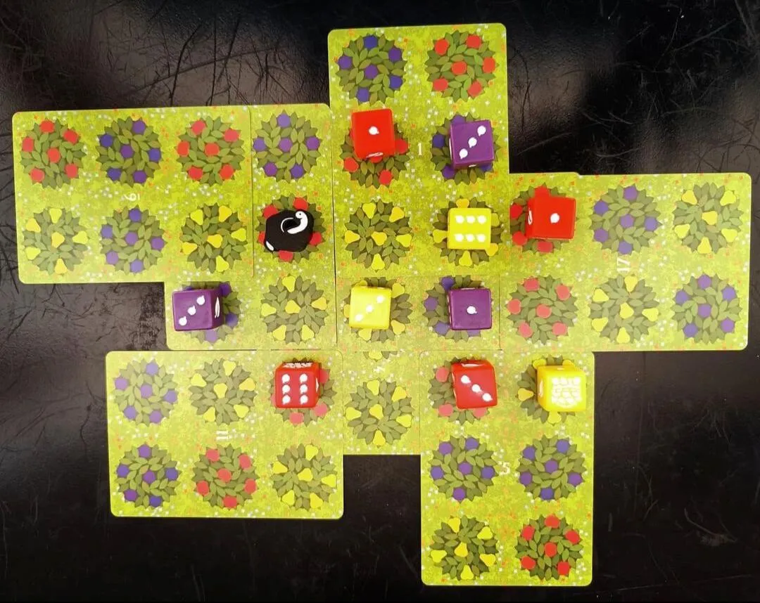 Mele, pere e susine. Quindici dadi, diciotto semplici carte e un regolamento. Costruisci il tuo frutteto e raccogli più frutta possibile.
